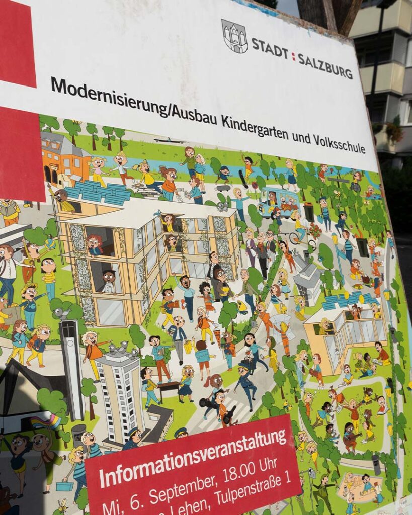 Zur Vermittlung von Informationen rund um Orte, Angebote und Tätigkeiten sind Wimmelbilder ideal: Etwa für einen Infoabend zum Bau eines Kindergartens, ein neues Kursangebot an der Volkshochschule oder die Wiedereröffnung einer Rennbahn.