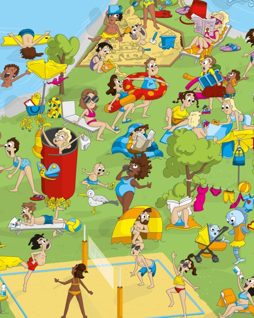 Ein Wimmelbild verleiht Events ein starkes visuelles Branding: Das Motiv macht auf einen Blick deutlich, dass die jeweilige Marketingmaßnahme zum Event gehört. Zudem sind die Inhalte des Wimmelbildes exakt auf das Unternehmen oder den Zweck des Events abgestimmt, sodass das Motiv sowohl thematisch als auch visuell die Identität des Anlasses trägt.